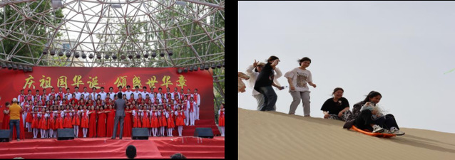 我还参与了一些学生校园活动。4月18日和九3班的孩子们一起前往沙海碧湖,参加放飞青春,放飞梦想--风筝节。放风筝、滑沙、沙漠足球、感受到了孩子们的天真与活力。 4月28日参加了策勒县教育系统组织的唱响红歌比赛,我负责本校部分的摄影工作。