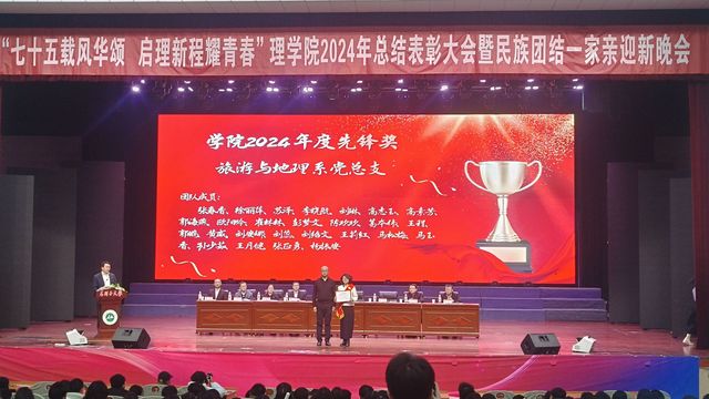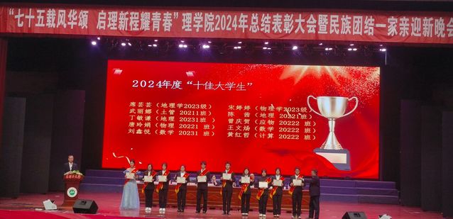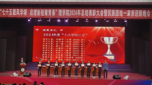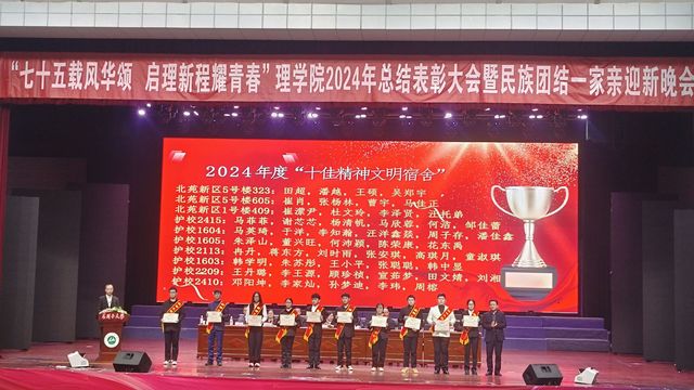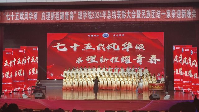 流光溢彩迎新夜,心心连心齐飞扬。2024年12月15日16时整,“七十五载风华颂,启理新程耀青春”石河子大学理学院2024年总结表彰大会暨民族团结一家亲迎新晚会于北区大会堂隆重举行。大会由学院党委副书记郭一敏主持,石河子大学人事处副处长路国栋、教务处副处长李玲、学生工作部副部长丁成、科研处副处长李江杰、学院党委书记任建、副院长王晓光、副院长徐丽萍、副院长韩志全以及学院师生共同参加本次大会。
